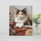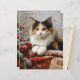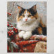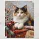Scrapbook paper featuring a painting of beautiful calico cat in a winter scene surrounded by red berries, pine sprigs and cozy fabrics.