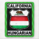 California Hungarian design, in the style of a cool American road route sign. The text California Hungarian is along the top and bottom, with the flag of the State of California and the flag of Hungary inside the route sign. Great for Californians of Hungarian descent, and for ex-pats in the Republic of California!