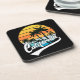 California coasters with a retro design that features a sunset and palm trees on black background (customizable bg color). This design also has California in a handwritten font with a swash tail glyph for that stylish retro look. These coasters are just for you if you are from California or you can get as a gift or souvenir for someone.