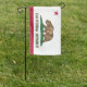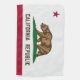 California's state flag features a single red star in the top corner, a red stripe along the bottom, and a depiction of a California grizzly bear on a patch of green grass against a white background.