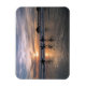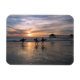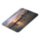 Iconic Huntington Beach "Surf City" photography features trio of surfers silhouetted against ocean, pier and sunset.