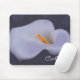 This mousepad features an illustrated calla lily (Zantedeschia aethiopica) in a muted grayish purple with an orange and yellow center. There is a personalizable text area in the bottom right corner in simple cursive script.