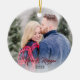 Simple and elegant holiday ornament features a photo on each side with personalized names overlaid in burgundy plum script lettering. Personalized with the year beneath on one side, and your family names on the top.
