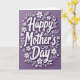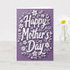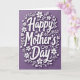 This card features the words “Happy Mother’s Day” centered in smooth white lettering, with a soft shadow that makes the text look gently raised from the surface. The background is a deep violet field that feels calm and affectionate, like a quiet moment shared with someone you love ❤️. Around the message, a wreath-like ring of white flowers and thin leafy stems curves in an even circle, giving the layout a tender, embracing feel. Smaller blossoms and sprigs vary in shape and size, adding natural variety while keeping the focus on the center. Tiny white dots are scattered between the leaves and around the letters, like light confetti or little pearls that add a hint of sparkle 🌼. The main phrase sits squarely in the middle, while the floral elements stay near the edges to frame it without crowding the words. The final look is crisp white details against rich violet, with delicate shadows under the lettering and a few petals pointing inward toward the center.