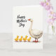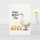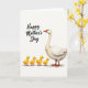This card features a long-necked white waterfowl standing on the right side of a bright white background, angled slightly toward its little group with a tender, watchful gaze ❤️. Across the lower middle, four fluffy yellow hatchlings march in a neat line, their tiny bodies close together as if reassured by the adult’s steady presence. Soft gray shading along the adult bird’s feathers and under each figure adds gentle depth without crowding the open space. The young birds’ lemon-yellow down contrasts with their small orange beaks and feet, and the adult bird’s matching orange beak and webbed feet ties the colors together. In the upper left area, the words “Happy Mother’s Day” appear in black, flowing lettering that feels light and airy against the white. The spacing leaves plenty of breathing room, making the family scene feel calm and affectionate, like a quiet walk taken together 🌼. Subtle shadows sit just beneath the birds, grounding them on the page while keeping the background uncluttered.