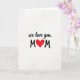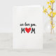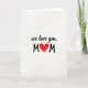This card features a simple white background that leaves lots of open space for a quiet, affectionate look. Near the top center, the words “we love you,” appear in flowing black lettering, like ink drawn by hand. The gentle curves of the letters feel like a soft voice, adding a touch of closeness ❤️. Beneath that, two large uppercase “M” letters sit apart in black, creating a balanced frame. Between them is a red heart, painted with visible brush marks that make it feel warm and sincere. The strong contrast of black text and red paint draws your eyes straight to the center, like a small moment of connection 🌼. Soft, even lighting keeps the white background bright while the heart’s textured red edges remain clearly visible.