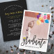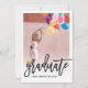 A modern and stylish minimalist 2-in-1 graduation party invitation and grad announcement card design featuring a custom photo within a white frame and simple bold calligraphy brush script with a mortar board / graduation cap accent.