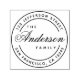 An elegant round return address stamp. In the center, the name is written in an elegant calligraphic script, with the word "family" in small caps under it. . It is surrounded by address, written between two circles, with caps, the street above, the city and state below. The smaller circle is interrupted.