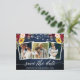 Modern Calligraphy Script, Rustic Blue Wood and String Lights, Watercolor Burgundy Marsala Floral Save The Date Engagement Announcement Couple 3 Photo Postcard. Burgundy Roses, Pink Roses, Red Roses, Sunflowers and Botanical Greenery.