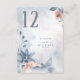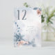 A handwritten, signature font combined with a modern sans serif is used in this floral stationery collection to set a warm and intimate tone for your wedding. The wedding table numbers card shown here features corner borders of lush flowers and foliage in shades from dusty blue to soft pink blush against a background of dreamy watercolor paint splashes. Add your table numbers, names and wedding date using the provided template. Search ID771 to see other pieces and color choices for this set.