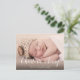 This pretty modern birth announcement postcard features elegant calligraphy and a large photo. The front of the postcard showcases your newborn with a horizontal full-bleed photo and the baby's name written in white script lettering (the design works best with darker photos that will allow the white lettering to be read easily). Below, add birth details and your names. On the back, you can write a custom message to loved ones.