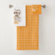 Stylish and fun, this bath towel set is the perfect way to shop the fall season. Features green leaves, an orange pumpkin, and brown and orange script text "Pumpkin Spice and Everything Nice" on the hand towel. The same design in all white is on a washcloth with an orange background. The bath towel is the same orange with white polka dots. Great gift for friends and family to show thanks during Thanksgiving.