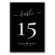 Elegant Calligraphy Script Heart Black Wedding Table Numbers Double Sided with custom personalized. Help your guests easily find their way with these simple elegant double sided table number cards. Easily to personalize, featuring numbers, couple names with love heart motif and date! Features a pretty hand lettering calligraphy "table" script in white on black background. Ideal for minimalist elegant and modern weddings.