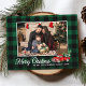 A beautiful rustic style, green plaid - tartan holiday postcard featuring a watercolor vintage red truck loaded with trees, with "Merry Christmas" calligraphy script, your family name, year or other text and your family photo. Personalize your message on the back of the card for the perfect touch.