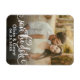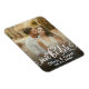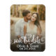 A romantic and minimalist save the date magnet featuring a full-bleed portrait photo with sweeping white calligraphy script and swash flourishes across the lower half. Clean white sans-serif names and date below keep the design polished and easy to read. A timeless keepsake guests will want to display all year. Fully editable names and date.