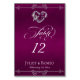 The design features an elegant plum (purple) background embellished with scroll borders, a heart and placeholders for the table number, couple's names and date of event. Available in several colors for your wedding theme. (Glitter is simulated in the artwork). Designed to coordinate with the Romantic Scroll Hearts & Calligraphy Wedding Collection. To change details, click «Personalize». To move the text or change the text size, font, or color click «Click to customize further».