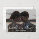 For the health of everyone and due to social distancing guidelines, it is better to downsize your wedding but still make your wedding announcement chic, simple, minimal and elegant with this photo downsized wedding invites to send to your family, friends and loved ones in the height of the COVID-19 pandemic. It features a simple modern minimalist looking calligraphy font saying "smaller wedding" and a bold font saying of bride and groom's name at the front. Personalize your message to the guests and wedding details at the back.