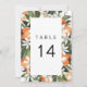 This table number features a watercolor orange blossom frame and simple script font.