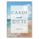 This wedding tabletop sign features a serene beach scene with gentle waves and a sandy shore under a partly cloudy sky, creating a tranquil seaside atmosphere. The design uses soft blues for the ocean and sky, warm beige tones for the sand, and subtle white highlights to suggest sunlight reflecting off the water. A centered rectangular overlay contains the text "CARDS and GIFTS" in large serif letters, with "thank you" written below in a simple sans-serif font, enhancing readability against the background. The overall mood is one of gratitude and relaxation, making it perfect for expressing appreciation at your special event.