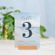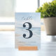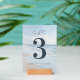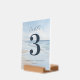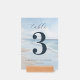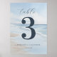 This wedding table card features a serene beach scene with gentle waves and a soft blue sky, creating a tranquil and romantic atmosphere. The design includes a bold navy numeral "3" at the center, complemented by elegant cursive typography for the word "table," while customizable placeholders allow for personalization with names and dates. The color palette of calming blues, whites, and sandy beiges enhances the peaceful seaside theme, making it perfect for adding a touch of elegance to your special day.