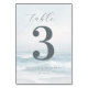 This wedding table card features a serene beach scene with gentle waves and a soft pastel sky, creating a tranquil seaside atmosphere. The design includes a large numeral "3" in muted gray-blue, complemented by elegant cursive typography for the word "table." Customizable placeholders allow for personalization with names and dates, while the minimalist layout emphasizes clarity and sophistication. The overall style is modern yet timeless, perfect for adding an element of calm elegance to your wedding celebration.