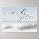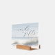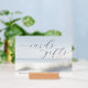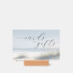 This wedding tabletop sign features a serene beach scene with gentle waves and tufts of grass, creating a tranquil seaside atmosphere. The soft color palette of light blues, sandy whites, and pale greens enhances the calming mood. Elegant script typography highlights "cards" and "gifts," while a simple sans-serif font adds a "THANK YOU" message at the bottom. Perfect for expressing gratitude in an understated manner, this design blends natural elements with graceful text to evoke relaxation and appreciation.