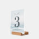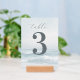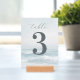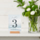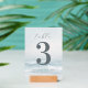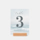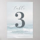 This wedding table card features a serene beach scene with soft waves and a calming oceanic atmosphere, using muted blues and whites for a tranquil vibe. The design includes a large numeral "3" in bold, dark gray, complemented by elegant cursive typography for the word "table." Below, names and date are presented in clean, sans-serif font, maintaining simplicity and readability. Perfect for adding a touch of elegance to your wedding event, this card combines natural motifs with modern style, creating an inviting and sophisticated look.