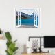 Beautiful calm mountain lake view, faux window scene, for a windowless office. Very realistic landscape optical illusion poster that would look great on an office or study wall.