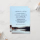 Tranquil memorial service invitation, featuring a photo of a calm mountain lake with forests and a pale blue sky.