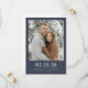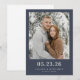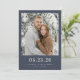 This wedding save the date features a serene winter scene with two individuals standing closely in a snowy forest, framed by a dark navy border. The design uses a cool color palette of whites and grays, complemented by warm browns from their clothing, creating a balanced and modern aesthetic. Clean, sans-serif typography is used for customizable text fields, enhancing readability against the dark background. The overall mood is calm and intimate, perfect for setting the tone for a special occasion.