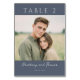 This wedding table card features a serene and elegant design with a rectangular layout divided into three sections. The top and bottom navy blue bands frame a central photograph of two individuals in a natural setting, creating a calm and intimate atmosphere. The minimalist style is enhanced by clean lines and neutral tones, while the typography combines a modern sans-serif font for "TABLE 2" with a flowing script for a personal touch. Perfect for adding a sophisticated yet romantic feel to your wedding reception, this card celebrates love and unity.