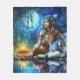 A serene night unfolds by the river, illuminated by a glowing campfire. A Native Indian woman, adorned in traditional attire and jewelry, sits peacefully beside a majestic wolf