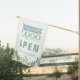 Greenery open flag for your small business where you can add your logo and custom text in a soft shade of green. With sprigs in shades of green. Open for business flag printed with your small business logo, OPEN in bold green letters, Welcome inside! beneath and lovely greenery in sage green shades.