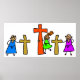 Whimsical childlike drawing of a little child holding the Easter cross of calvary and two other kids holding the thieves crosses on either side.