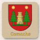 Hispanic surname Camacho family shield set of Coasters on a parchment style background.