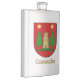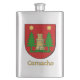 Hispanic surname Camacho heraldic shield drinking flask. Text below the shield is in a classical style font to match the colors on the shield.