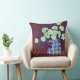 Opulent and unusual throw pillow/scatter cushion featuring Camellia flowers arranged in a bubble vase with greenery, and displayed on a striped table cloth. The FRONT is mainly burgundy and blue, cream, green, and a little black, whereas the BACK is mainly teal green, tan, purples, and white.