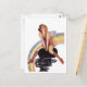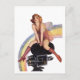 Vintage pin-up picture from a classic age. A fun, sassy picture of a retro pinup pose. Pinup rides a camera with a rainbow behind her.