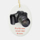 This item displays a blonde photographer with backpack and camera in hand. It is customizable with the first name of the recipient. The backside shows a camera with the words: It's not the camera, but who's behind the camera. Words are printed in red.