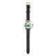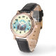 A watch with a cute watercolor design for shutterbugs. A black camera surrounded by azure blue leaves and butterflies in a pretty decorative arrangement.. Big bold clock numbers in black make this watch easy to read. Set on a cream colored background.