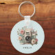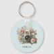 Keychain with a vintage styled camera decorated with flowers. Pastel colors of pink, cream and green.