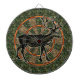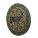 This hunting themed dartboard has a picture of a deer / reindeer that is brown with large antlers. It also has a green and brown camo pattern and alternating shades of orange. This is a great game board for outdoorsmen, hunters and men with camouflage-themed man caves. See more variations in our store!
