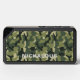One of a kind design features green black and yellow camouflage with your name in white block letters.