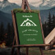 A modern, elegant and chic bachelorette party weekend welcome sign with a camping theme, featuring minimalist drawings of a camping scene in the mountains in a forest green color scheme. A beautiful, earthy and natural choice for a bachelorette glam weekend of fun camping, hiking or anywhere outdoors, in a soothing, soft, outdoors natural, organic colors and a minimalist modern style.