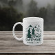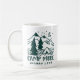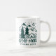Cute camping themed mug features the quote "camp more, worry less" in distressed hunter green lettering beneath a hand drawn illustration of a camping tent set in a pine forest with a crescent moon rising over snow-capped mountain peaks. A perfect gift to commemorate a special family camping trip, or for anyone who loves camping in the great outdoors.