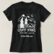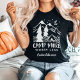 Create a unique custom t-shirt for your next family camping trip or outdoor excursion. Tee features the quote "camp more, worry less" in distressed white lettering beneath a hand drawn illustration of a camping tent set in a pine forest with a crescent moon rising over snow-capped mountain peaks. The perfect way to commemorate a special trip, or for anyone who loves camping, you can customize this camping shirt with your choice of text beneath the design. Add your camping destination, the year, or a family name for a special touch.