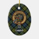 Campbell crest badge surrounded by a strap and buckle over tartan background. Custom text on both sides.