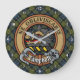 Campbell crest badge surrounded by a strap and buckle over tartan background. Custom text.