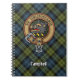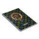 Campbell crest badge surrounded by a strap and buckle over tartan background. Custom text.