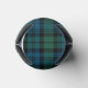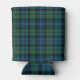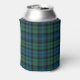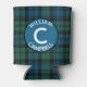 Stylish plaid can cooler done in the classic Scottish blue, green and black clan Campbell tartan plaid pattern. A blue and black circle, on the front, has a white single letter monogram and curved white text fields ready to personalize.